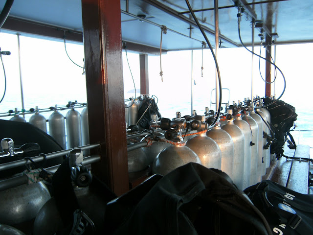 Ngày chủ nhật, xe của Diveasia tới đón chúng tôi từ 7h:30 sáng. Cung cách phục vụ cũng giống như các trung tâm lặn biển khác ở VN. Xe chạy một vòng các KS, khu Resort để đón khách lặn. Tôi thấy nhiều khách lặn mang theo trang bị của mình, cả các phương tiện quy phim, chụp ảnh rất xịn. Sau khi tập trung ở văn phòng Dive Asia để nhận trang bị và làm các thủ tục giấy tờ cần thiết, chúng tôi đổi xe lớn và ra cảng.
