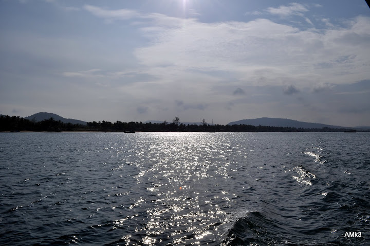 Chiều muộn, chúng tôi trở về theo con đường chạy dọc theo bờ Tây đảo. Có thể thấy cảnh hoàng hôn từ phía này. Biển lặng như mặt hồ.