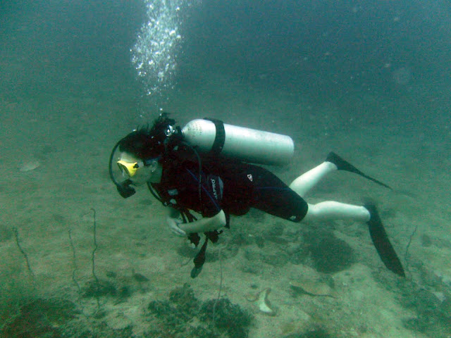 Sau gần 2 giờ chạy, tầu dừng tại điểm lặn đầu tiên: Phi Phi Don. Đảo này có nhiều vách đứng và dòng chảy nhẹ. Biển lặng, tầm nhìn dưới nước không tốt lắm - chỉ khoảng 6m.